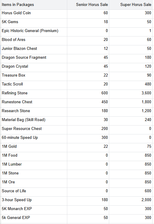 You can receive more Horus Gold Coins and other valuable items by purchasing Senior and Super Horus sale packages. The details are as follows.